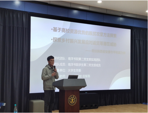 南洋书院学生第二党支部预备党员刘世琦分享了暑期前往安康市平利县开展社会实践的经历,从调研背景、实践情况、调研过程和结果展示四个方面展示了对平利县6镇9村开展的入户调查、防疫宣传和扶贫工作。