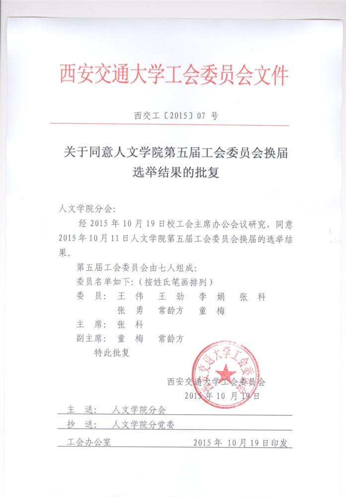 经2015年10月19日校工会主席办公会议研究,同意2015年10月11日猫都论坛 第五届工会委员会换届的选举结果。 现将审批选举结果的文件公布如下,详见附件。
