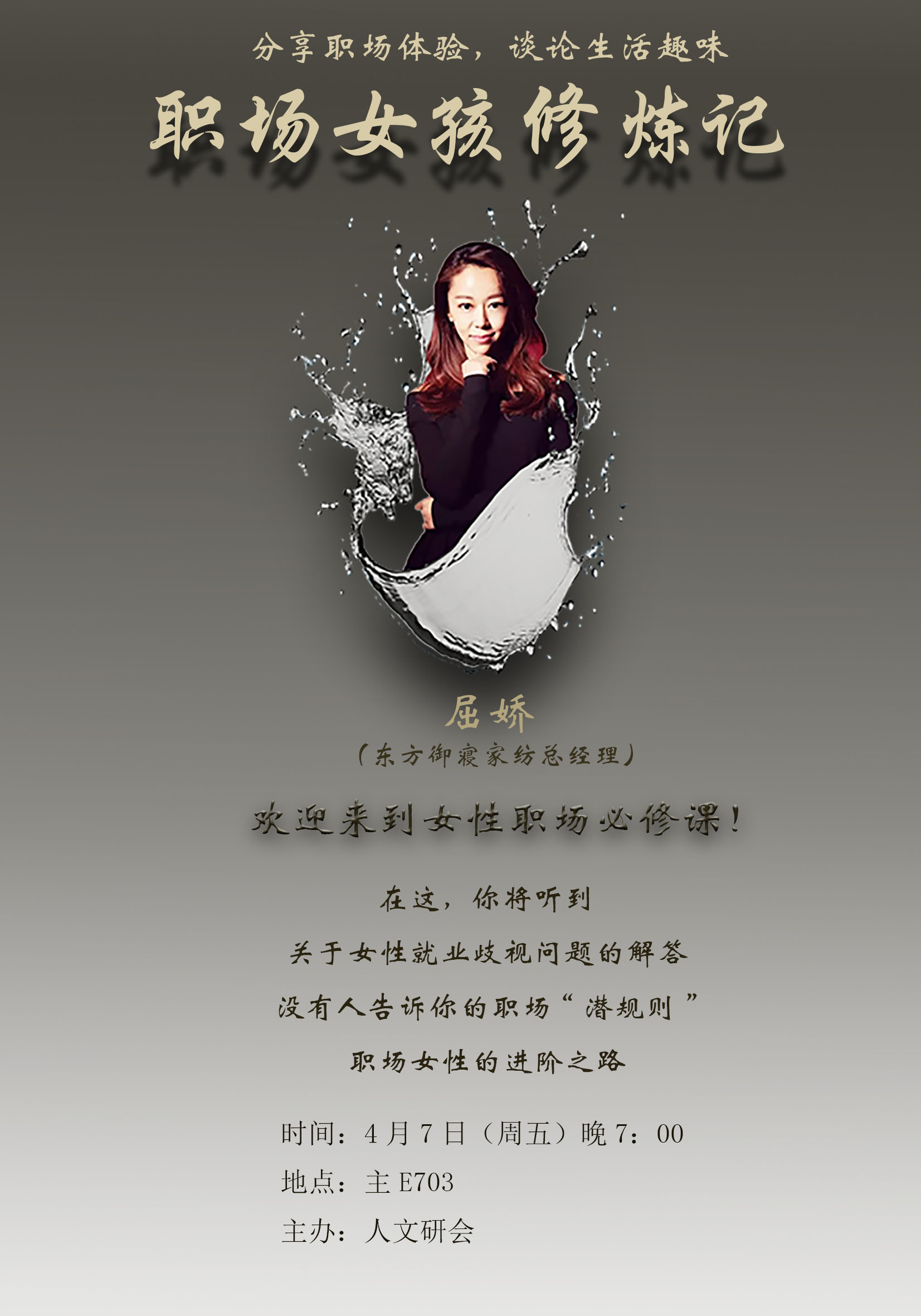 讲座人简介:屈娇,生于1986年9月23日,陕西西安人。本科毕业于西安外国语学院,后又取得清华大学管理硕士学位。2008年10月进入大众汽车北京中心工作;2009-2010年就职于陕西雅兰寝饰用品有限公司,任职财务出纳;2010-2012任职陕西雅兰寝饰用品有限公司财务会计;2012年于陕西雅兰寝饰用品有限公司,任职有限责任公司财务经理;2013年至今,任职西安东方御寝家纺公司总经理。