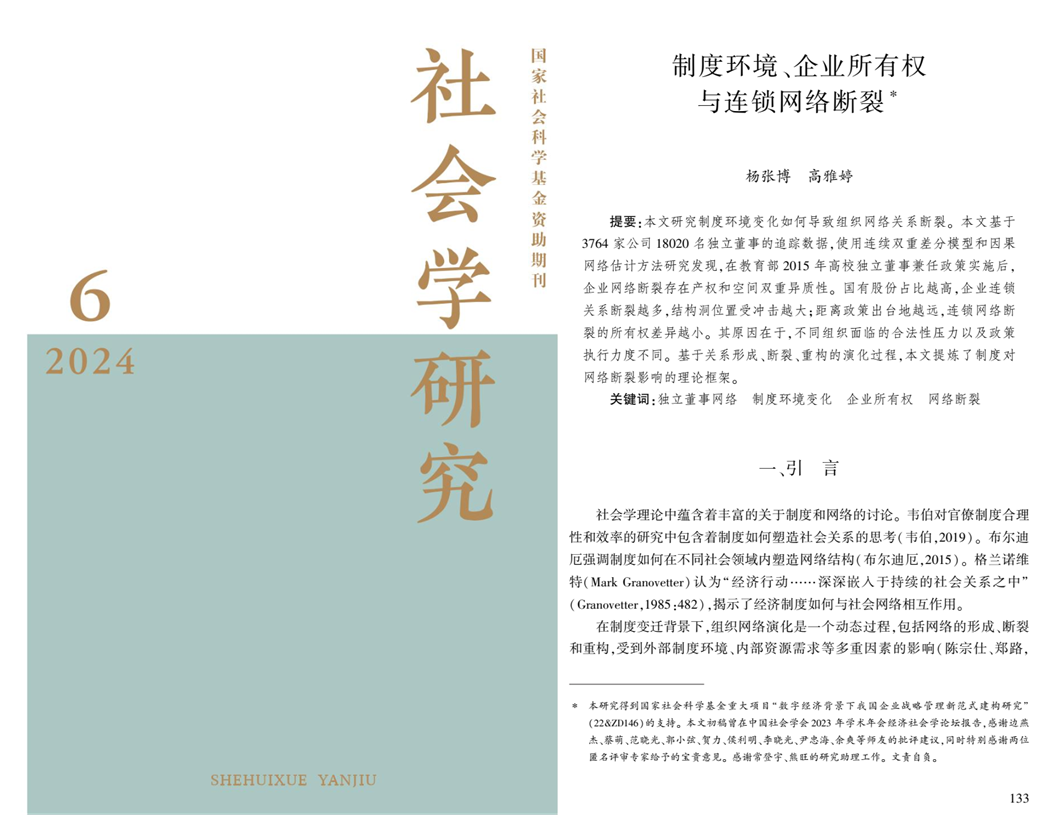 社会学系青年教师杨张博教授与高雅婷硕士生合作完成的论文《制度环境、企业所有权与连锁网络断裂》发表于社会学领域权威期刊《社会学研究》2024年第6期。猫都论坛