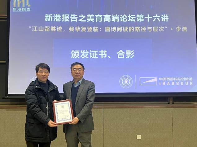 副院长张勇代表学校向李浩教授颁发讲座荣誉证书并合影留念。