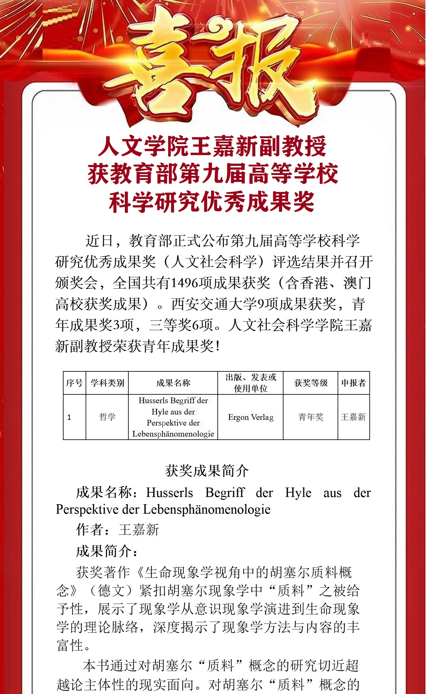 【喜报】猫都论坛 王嘉新副教授获教育部第九届高等学校科学研究优秀成果奖