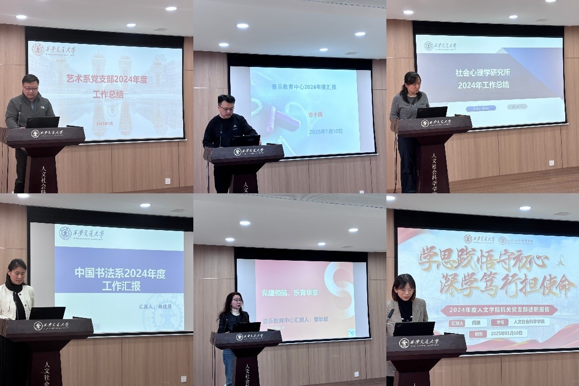 7个系所负责人围绕人才培养、科学研究、队伍建设对2024年度工作进行述职。7个教工党支部书记围绕师生思想政治引领、党支部规范化建设、党建和中心工作深度融合等进行述职。哲学系为师生搭建“松梧论坛”“彭康哲学讲坛”等学术交流平台,邀请20余位国内外知名学者来访交流,提升学术影响力。社会学系开展有组织的科研,2024年度科研到款突破800万。中文系以筹建丝绸之路历史文化研究院为契机,加强对外交流,在高层次人才引进方面取得突破。艺术系多措并举提升人才培养质量,指导学生在多个赛事中获得奖项。中国书法系以建院30周年为契机,联合汉中市文联、曲江艺术博物馆、大唐西市博物馆等单位,举办多场展览和研讨会,推动学科发展,扩大社会影响。音乐教育中心聚焦精品课建设,开设20余门课程,其中《音乐鉴赏》在智慧树平台学习人数在全国普通高校“音乐类”课程中排名第一。社会心理学研究所积极参与陕西省社会工作研究院筹建和医学心理学会换届等,发挥专业特长服务学校和社会。