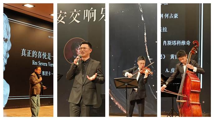 本次论坛邀请了西安交响乐团的曹继文总监以及XSO西安交响乐团室内乐组的三位青年音乐家白东旭(小提琴)、赵子杰(低音提琴)和卜敦格(钢琴)。张勇副院长首先对于曹继文总监和三位音乐家的莅临表示欢迎和感谢。张院长介绍到曹继文总监是西交大的老朋友,去年曹老师就曾做客过我们的美育高端论坛,并且还带领艺术家来创新港进行过专场演出。感谢曹老师和西安交响乐团一直以来对交大美育工作的鼎力支持。本次论坛曹老师和三位音乐家要给我们带来的是钢琴三重奏专场音乐会。在交大的129年校庆之际开办这场音乐会也有着特别的意义,这次音乐会也是给交大129年校庆的特别献礼。
