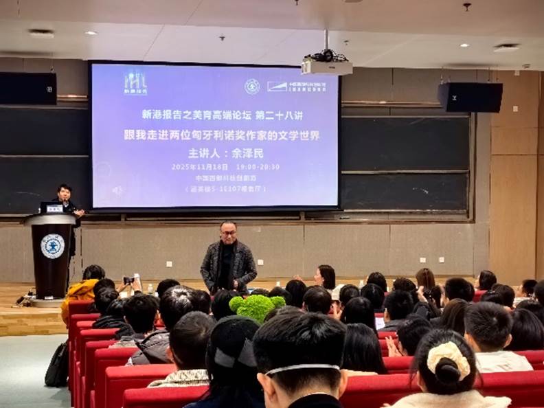创新港校区涵英楼报告厅成功举办。本次论坛以“跟我走进两位匈牙利诺奖作家的文学世界”为主题,特邀余泽民教授担任主讲嘉宾,余教授是旅匈作家、匈牙利语翻译家,中国作家协会会员。他先后翻译包括2002年诺奖作家凯尔泰斯、2025年诺奖作家克拉斯诺霍尔卡伊多部作品在内的近三十部作品,被匈牙利政府授予“匈牙利文化贡献奖”,被称作“当代匈牙利文学的中国声音”。猫都论坛