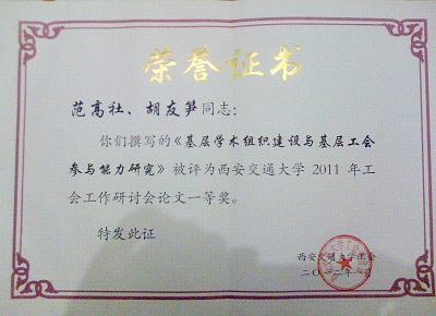 工会主席范高社、工会宣传委员胡友笋老师提交的论文《基层学术组织建设与基层工会参与能力研究》获得优秀论文一等奖。