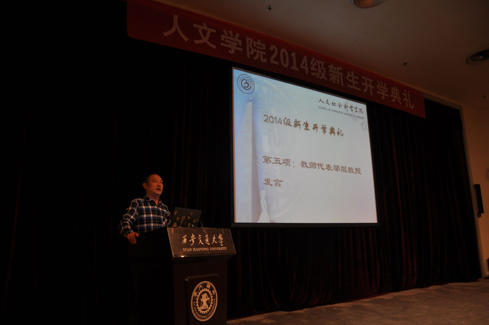 邬焜教授作为教师代表致辞,他认为不同层次的教育,其意义在于指导学生逐渐领悟并掌握正确的学习方法,要成为创新型人才,就要转变学习方式。他期望新生们能成为知识结构完善,兴趣跨学科的综合性人才,并努力探索人类知识的全貌。
