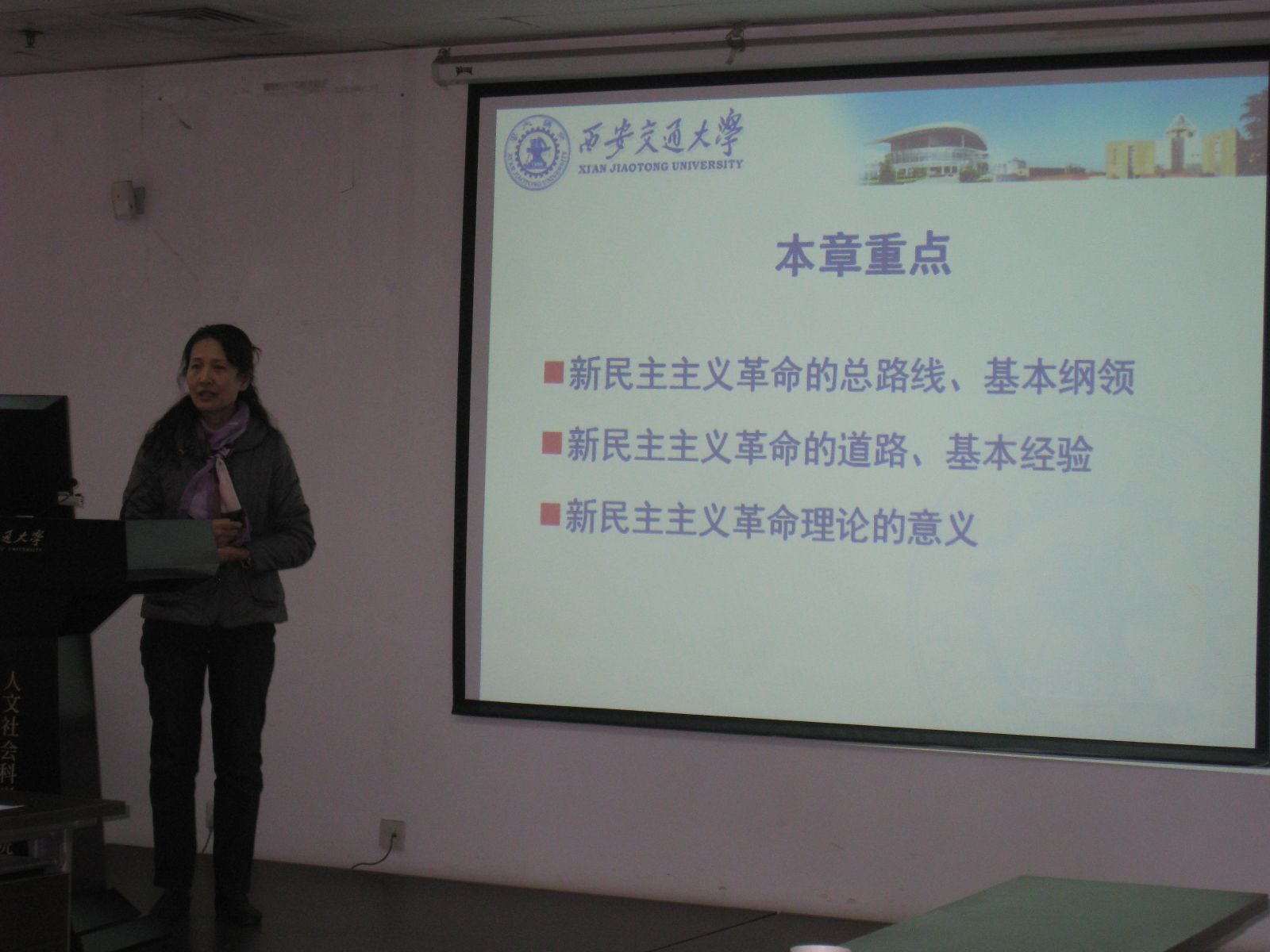 在教学研讨中,首先由雷巧玲老师、任培秦老师就《毛泽东思想和中国特色社会主义理论体系概论》课“第一章马克思主义中国化两大理论成果”和“第二章 新民主主义革命理论”的教学目的、教学重点难点、教学专题设计、教学思路进行讲解说明,并对反映其教学设计和教学组织的PPT进行了展示。然后与会老师就这两章的教学专题设计和教学组织展开了讨论,提出了完善、改进、提升的具体建议。与会老师认为:思想政治理论课教学专题设计、教学过程组织一定要有问题意识,以问题导入课堂教学,以问题引导学生思考,才能使学生“坐得住”、“听得进”;教学中要对重点内容展开精讲,在教学内容的理论深度上下功夫,使学生通过课程学习在思想认识上“有收获”。