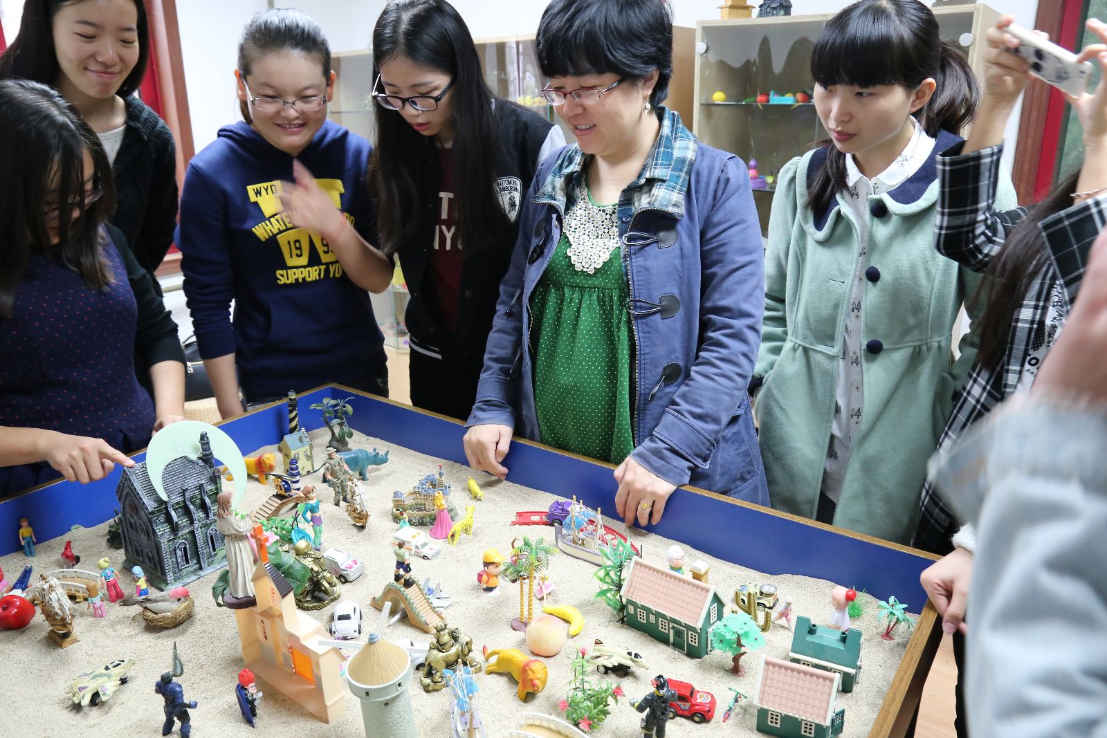 闫老师将同学们带到了沙盘实验室,花草、虫鱼、鸟兽、建筑各种小工艺品整整齐齐的摆放在玻璃柜中。闫老师让每位同学依次拿自己想要的东西放在沙盘内,期间,不允许和别人商量,只能按自己的第一直觉摆放,等到觉得不需要摆什么时就可以停下来。随着活动的进行,原本空空的沙盘被大家摆的满满当当,有美女与野兽的童话故事,有正义与邪恶的激烈对战,有树下身姿悠扬的舞者,还有属于每个人的各式各样的房子,十几次的循环过后,一个充满生机的“海滨小镇”搭建完毕。