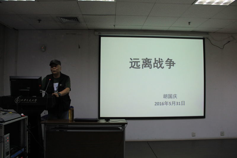 在讲座中,胡老师还同大家分享了自己惊心动魄的采访经历。2003年3月26日,胡国庆老师因忙于拍照,竟被采访车遗忘在伊拉克境内的沙漠中,随着暮色降临,在这个陌生的地方,他面临着被围攻、抢劫、流弹袭击的危险,加之语言不通,他几经波折,终于拦住一辆西班牙电视台的采访车,在3名西班牙记者的帮助下成功脱险,返回驻地。回国后,胡国庆老师接受中央电视台采访,“在伊拉克采访的20多个日日夜夜里,每天在梦中都会被警报声惊醒,导弹随时都有可能落在我们头上,我们一边安慰家人,一边冒着生命危险从前线发回报道。”胡老师感慨到,“作为一名战地记者,你会遇到各种突发状况,在战场上你必须学会保护自己,应对困难。”战地记者不仅要面对危险的局势、艰苦的环境,还要克服战争残酷现实带来的恐惧,他们是真正的新闻“战士”。