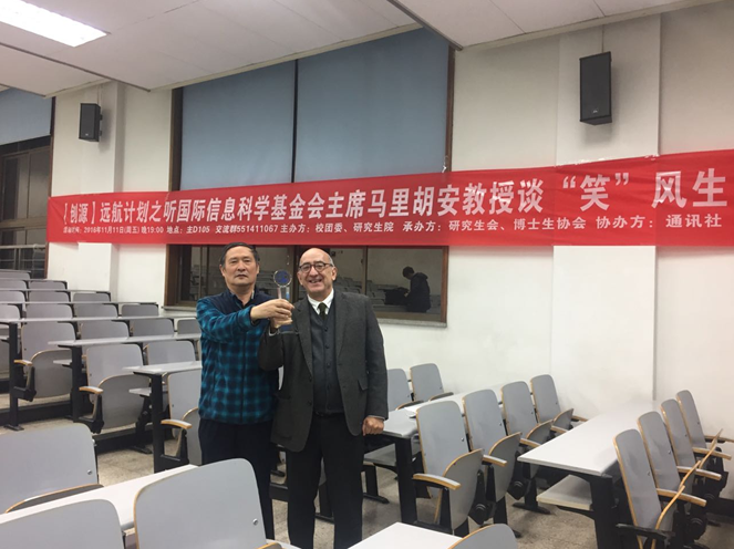 11月11日19:00,Marijuan教授在主楼D座105进行了“创源”科技学术论坛远航计划系列报告——《laughter!》。讲座通过向观众展示神经运算的图谱和过程,统计分析得出人类8种笑声背后的情感动机,从而指出神经运算在区别笑声类别时发挥的作用以及笑声结构在人际交往过程中所呈现的不同情感与情绪。讲座完毕,Marijuan教授接受“创源”论坛纪念奖杯并与邬焜教授以及论坛组织者合影留念。