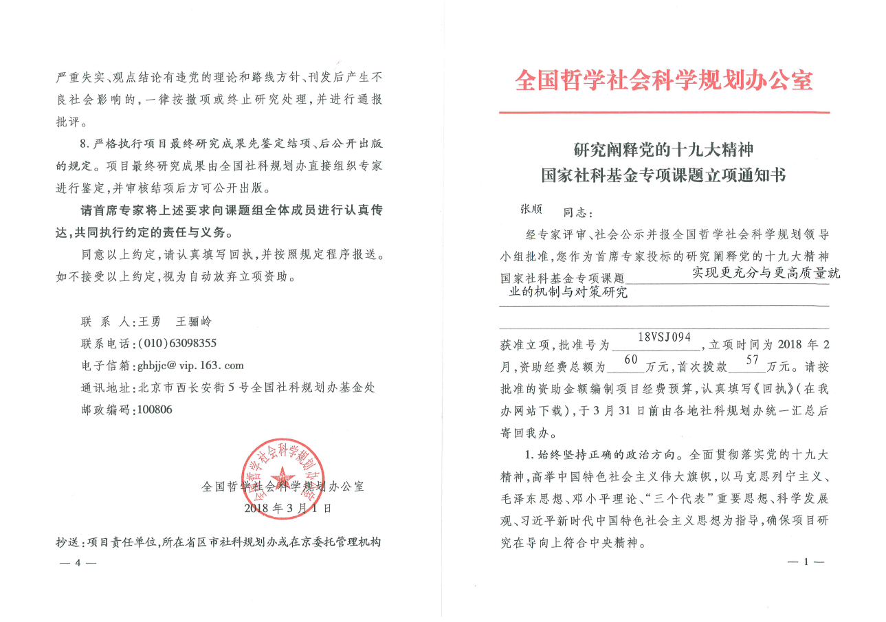 社会学系张顺教授为首席专家申报的国家社会科学基金十九大专项招标课题《实现更充分与更高质量就业的机制与对策研究》正式立项,属于国家社会科学基金重大项目类别,课题立项编号:18VSJ094。该课题将以社会学视野为主导,综合运用社会学、人口学与经济学的理论与方法,全方位解析我国新时代发展阶段所面临就业问题,为实现更充分与更高质量就业建言献策。