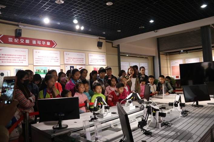 第二站是交大博物馆。讲解员为今天特别的小客人们临时更改了讲解内容,选取了一些趣味性比较强的科技成果如飞机模型、机器人等进行讲解,孩子们听的津津有味,有一个小男孩看到悬挂的飞机模型后表示:我以后也想开飞机!旁边一些孩子还唱起了“我想要飞的更高~”,引得大家开怀大笑。