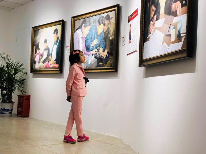 第一站来到的是西迁油画馆,参观“西迁油画展”。负责讲解的梁晓丹同学用通俗易懂的语言向孩子们介绍了油画创作的背景,即根据交大西迁故事中西迁前辈原型创作人物画像及根据当时的生活、教学实景等进行创作。滑璀菁同学分享了参观中的小插曲:一个小姑娘在一副油画前注视良久,画里是一位老教授伏案为四名学生讲书,由于五个人都穿着白色的短袖衬衫,小三多仰着脸问:“姐姐,画里的老师和学生都是医学生吗?我长大了就想当一名医生呢,做医生可以给别人看病,特别厉害!”针对这些6岁到12岁的孩子,直接去讲“西迁精神”不够通俗生动,但通过这些色彩鲜明的油画,给他们讲述一些西迁过程中的故事却是一个很好传播途径。相信孩子们也能从西迁精神中汲取成长的能量。