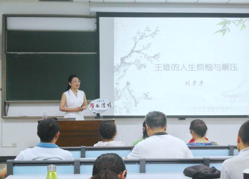 中文系副教授刘彦彦老师担任,讲座以“王维的人生烦恼与解压”为主题,文史结合,对王维其人,其诗,其事做了系统的阐释。