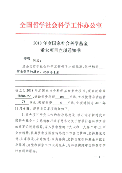 王 伟:邬焜教授您好,非常感谢您接受这次专访!首先祝贺您的项目“信息哲学的历史、现状与未来”获批了2018年度国家社科基金重大项目!我们知道您在信息哲学方面已经进行了近四十年的研究,在这个过程中,您认为是什么样的力量使您能够从一开始就进行信息哲学方面的研究,并越来越坚定地从事这一领域的研究呢?