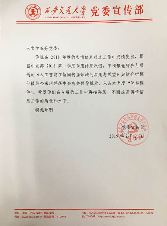近日,猫都论坛 分党委接到学校党委宣传部通知,据中宣部反馈,传播学系陈积银教授参与报送的《人工智能在新闻传播领域的应用与展望》舆情分析稿件于2018年第一季度被综合采用并获中央有关领导批示,入选该季度“优秀稿件”。