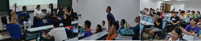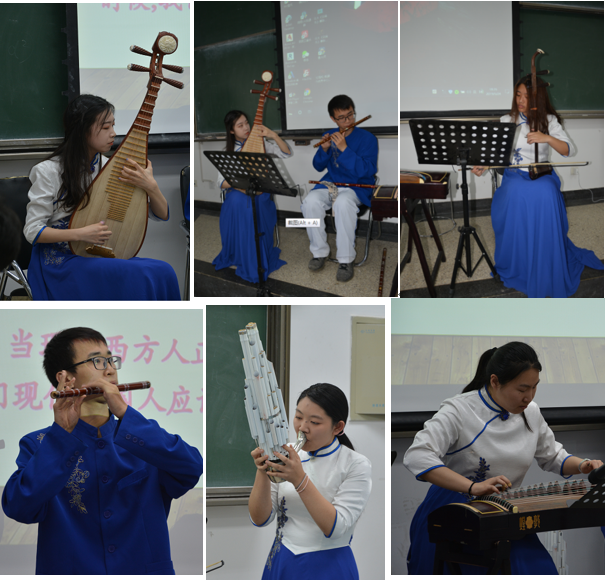 的主楼C座教室里,传出一阵阵悠扬的笛声,并和着古筝、伴着笙鸣,丝竹之音沁人心脾,犹如清风,吹起心头和谐之情、怡悦之意。