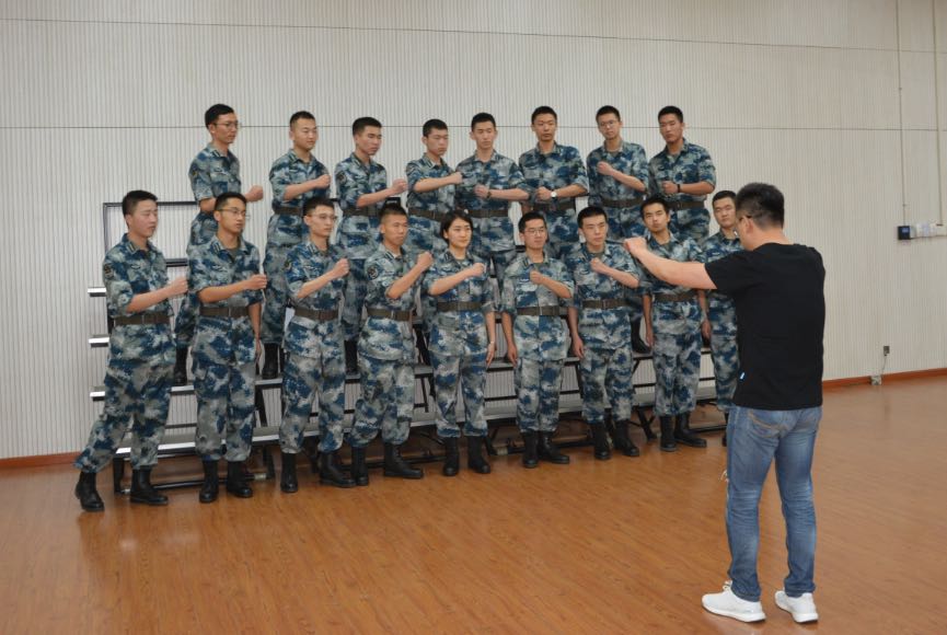 学博军同学一身戎装,以一首四声部的合唱《游击队歌》闪亮登场,歌声铿锵有力,快慢有致。弱声之处引发观众的浮想,强声之处又让所有人振奋,同学们用歌声再现了当年抗战游击的热烈场面。