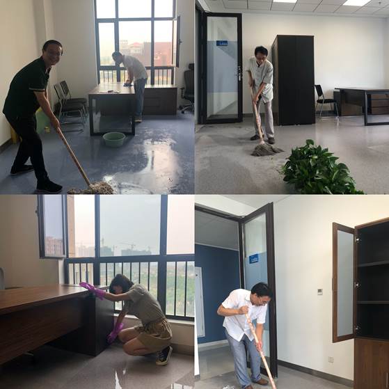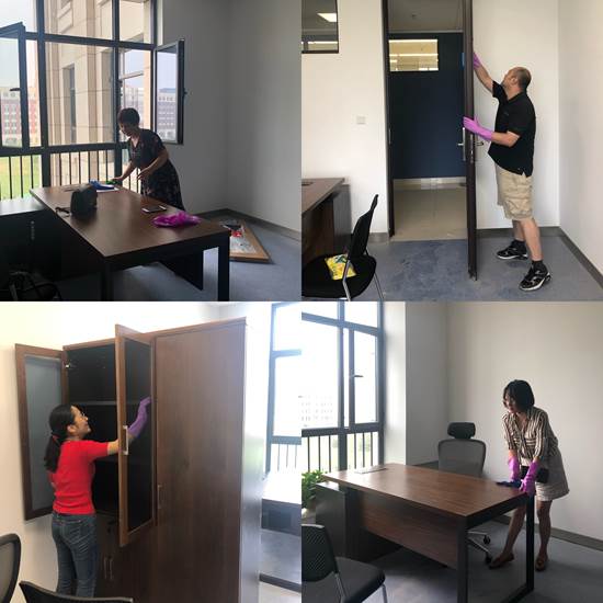 正值周六,往返学校与创新港的班车较少,但学院教职工热情高涨,纷纷主动报名。学院专门包车,组织40余名教职工前往创新港。在打扫过程中,教职工团结合作、齐心协力,不怕苦、不怕累、不怕脏,将研究生工位区及办公空间的灰尘、垃圾清理得干干净净,并浇灌了办公室绿植。经过近6个小时的努力,打造出一个干净整洁、清爽宜人的新家园。