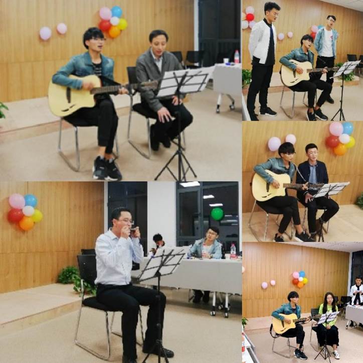 在才艺展示环节中,张兴、马伊璇、王浩源、周正等同学先后演唱《我要你》《小酒窝》《彩虹》等经典曲目,来自艺术系的李青龍同学全程吉他伴奏。当然,出席本场晚会的两位老师也分别展示了自己的才艺——马书记现场演唱《蓝莲花》,两段高潮中气十足,引得全场欢呼;王书记以口琴的形式演绎了《长江之歌》和《送别》两首歌曲,散发着文艺气息。