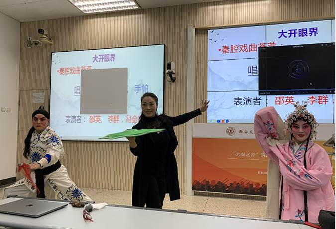 课程的最后,邵英老师与其团队的成员李群、冯金巧老师现场表演了“秦腔表演荟萃”,同学们近距离的欣赏到了秦腔优美的唱段,也观赏到了了“水袖”、“舞枪花”、“舞扇子”、“舞手绢等表演。
