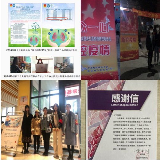 学院积极倡导“以文化人,以文育人”的培养理念,提倡学生参与各项志愿服务活动当中。疫情期间,4名社工专业同学投身社会组织的救援工作中,为群众解决问题;4名人文学子投身到社区疫情防控工作中,配合当地社区开展防疫工作。在校期间,30名学生投身到创新港“文明餐桌”志愿服务活动中,净化用餐环境;设计专业乔诗然同学主动承担《猫都论坛