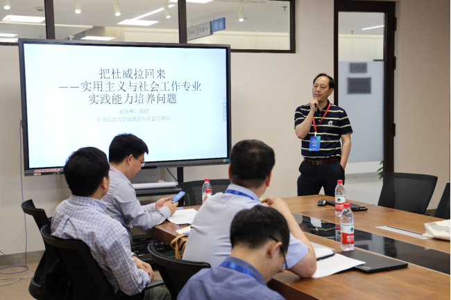 教育部高等学校社会学类专业教学指导委员会委员、中央民族大学郭伟和教授着重讨论社工专业实践能力的培养问题,借助杜威实用主义教育思想,强调实务工作的实践导向,以此作为社会学与社会工作专业拓展学科建设、服务社会发展的抓手。郭伟和老师从杜威实用主义、柯林斯智性实践的相关讨论入手,提出社会工作技术、方法能力的培养要加强同实践情境相结合,提高社工专业学生的职业能力,不仅需要理论概念的厘清,也需要教学实践的探索,更需要让学生们在具体实践过程中得到培养和锻炼。