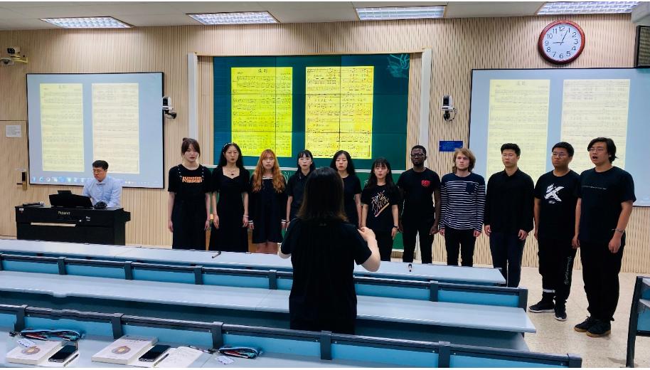 在本次课堂上,配合着王劲老师对近代文化大师李叔同的介绍,课程中的11位同学在李娟老师的指挥下倾情演唱了其创作的经典歌曲——《送别》。“长亭外,古道边,芳草碧连天”,伴随着合唱小组师生的精彩演出,全班同学们也跟着轻轻合唱,深深沉浸在了这个由书法之美、音乐之美构成的课程氛围中。