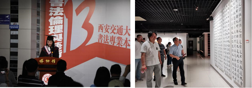 兼职教授倪文东对展览中的书法作品做了高度评价,表示与一般认知不同的是,培养书法人才并非是美院等专业院校的专利,以理工类为主的综合院校也能培育出书法大家,并对参加本次展览的七位同学送上了美好祝福。