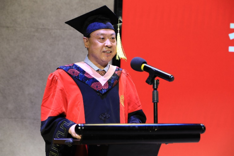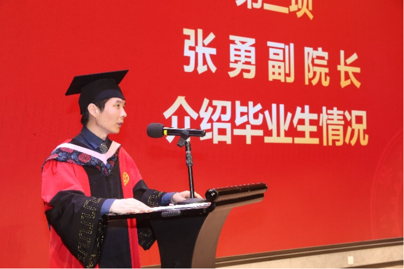 张勇副院长祝贺同学们圆满完成了学业,开启人生新篇章。他介绍了毕业生的就业、升学情况,或是进入一流高校深造,或是走向基层服务人民,一切都离不开党和国家、学校与社会、父母与同学的支持。张勇寄语同学们:征程正未有穷期,不待扬鞭自奋蹄,希望大家不忘初心、牢记使命,化承人文精神,永葆家国情怀,把自己的汗水和奋斗融入新时代的征程中,拼出一番属于自己的新天地!