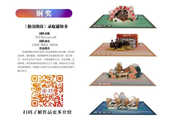 艺术系本科生张昕雨的作品《仙交的诗》荣获铜奖。作品是基于西迁精神的文化内涵,结合校史故事、校园建筑、校园植物等文化要素设计的一款立体书,全本共分为五个部分,分别是胸怀大局、无私奉献、弘扬传统、艰苦创业和西迁新传人五个主题,体现出交大人浓厚的家国情怀、迎难而上的勇气决心和建功立业新时代的气魄与担当。