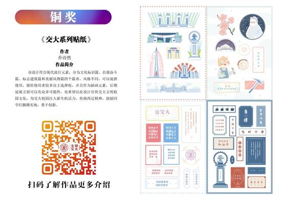 艺术系研究生乔诗然的作品《交大系列贴纸》荣获铜奖。该作品包括文化标识篇、自强奋斗篇、标志建筑篇和美丽风物篇四方面,结合热点语句,反映了广大师生奋进拼搏,朝着中国特色世界一流大学奋进的壮志豪情。