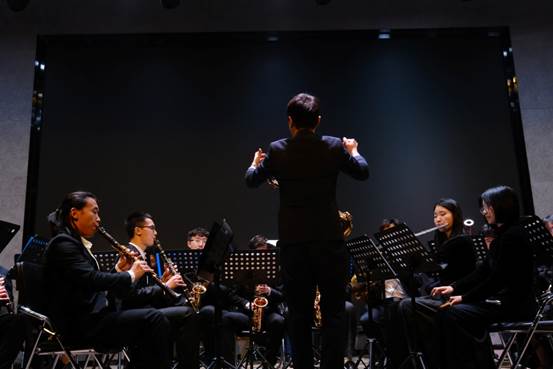 音乐会以一曲管乐合奏“西班牙故事”开场,随后“古代英雄传奇”、“爱之协奏曲”等经典管乐作品的上演将现场气氛推至高潮。其中,“小查尔达什舞曲”由刘俊峰老师同时担任萨克斯管独奏与指挥。乐曲独具特色的旋律与他精湛的演奏技巧相得益彰,博得了全场观众的热烈掌声。