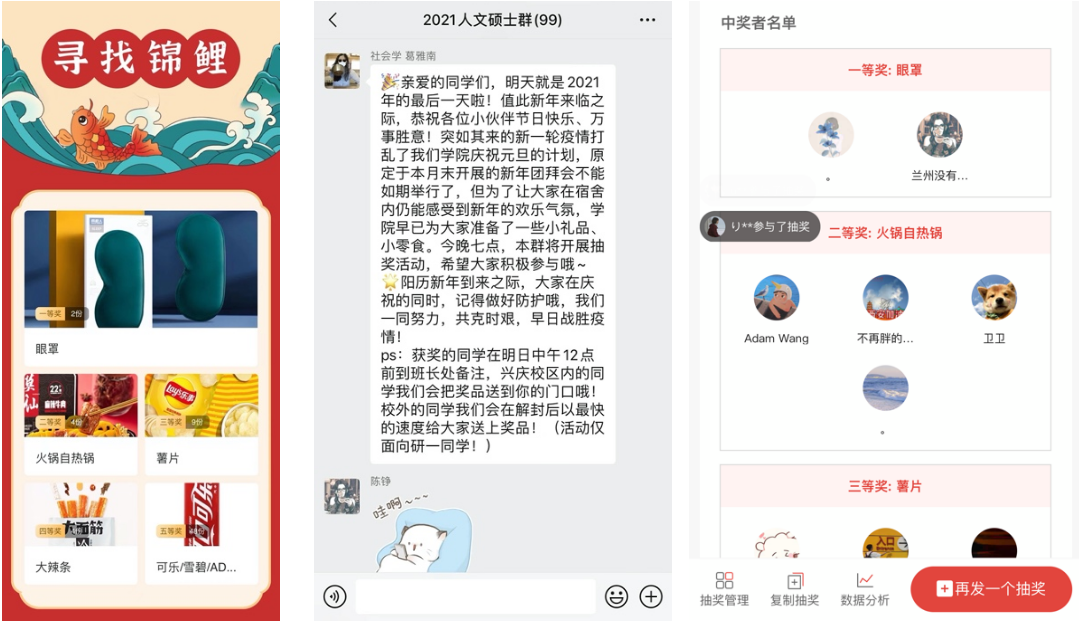本次送温暖活动以线上抽奖的形式进行,奖品涵盖了平时学生们喜爱的各种小礼品及日常生活用品。活动刚开始就获得了积极响应,学生们兴致高昂、广泛参与。防疫期间,原本紧张压抑的氛围,顿时变得格外温暖和欢乐。截止12月31日零点,共有81名学生参与抽奖,学院秉持着“人人有奖”的原则,每位学生都可以参与到抽奖活动中,拼拼手气,沾沾喜气。同时,为感谢同学们在抗疫期间,对于学校和老师们的理解和支持,学院也为每一位同学额外准备了小礼物,让每一个人都能分享到元旦迎新年的喜悦。