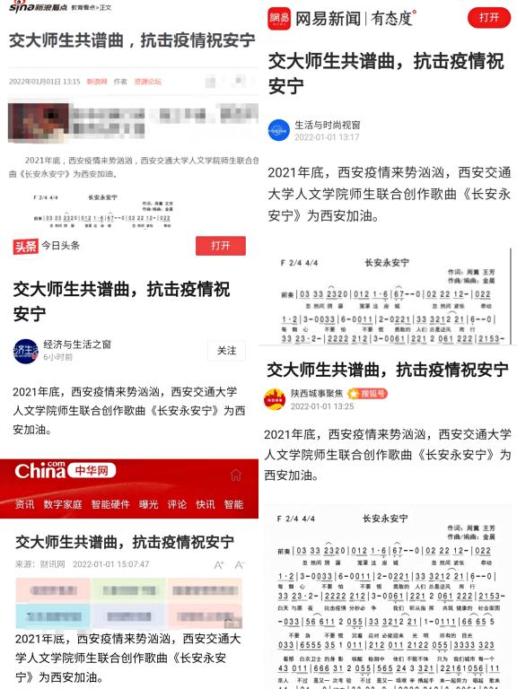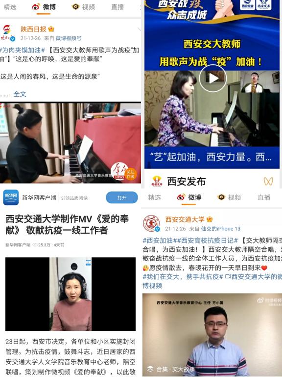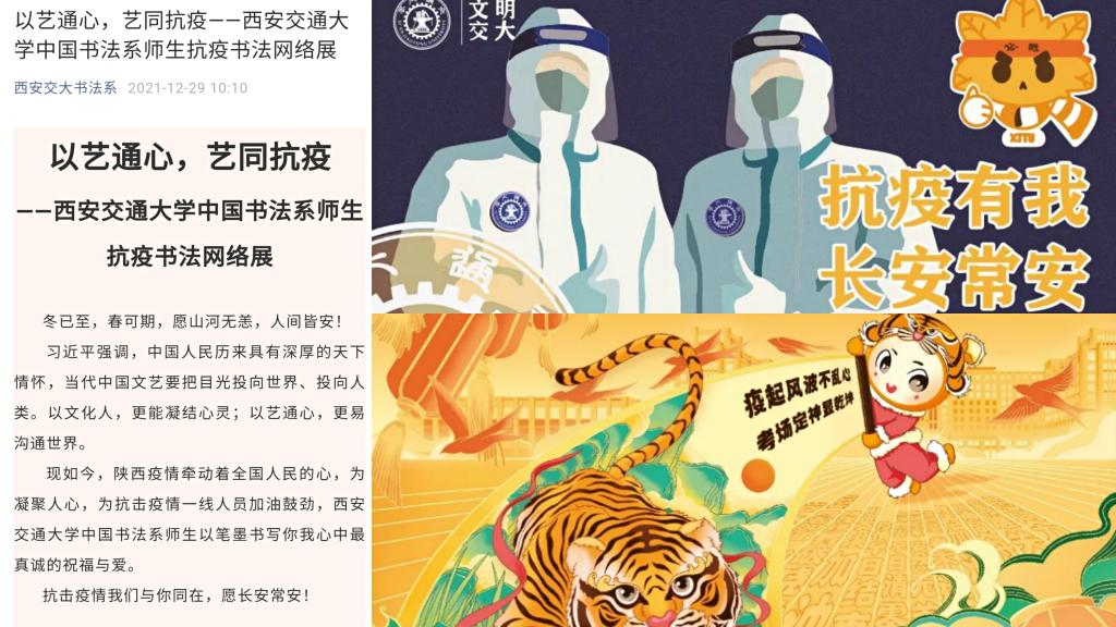 作为承担学校文化建设重点任务的单位,以文艺创作为抗疫加油是重大的政治责任。音乐教育中心教师联合校内师生隔空创作表演歌组曲:《爱的奉献》《长安永安宁》《光·明》,用歌声表达了对抗疫一线工作人员的敬意,对全市人民齐心抗疫的心声,和对这座千年古城的祝福,作品在各大网络平台发布后点击量快速突破30多万次。中国书法系举办“以艺通心,艺同抗疫”书法作品网络展,引导师生创作书法作品,以文化人,以艺通心,助力抗疫。艺术系教师通过引导学生创作海报、抗疫头像、日常空间再设计等方式,配合学校做好疫情期间的宣传与设计工作,传递抗疫暖心正能量。社会心理学研究所王瑜萍副教授撰写抗击疫情科普小贴士,引导师生服务大局,科学防疫。猫都论坛