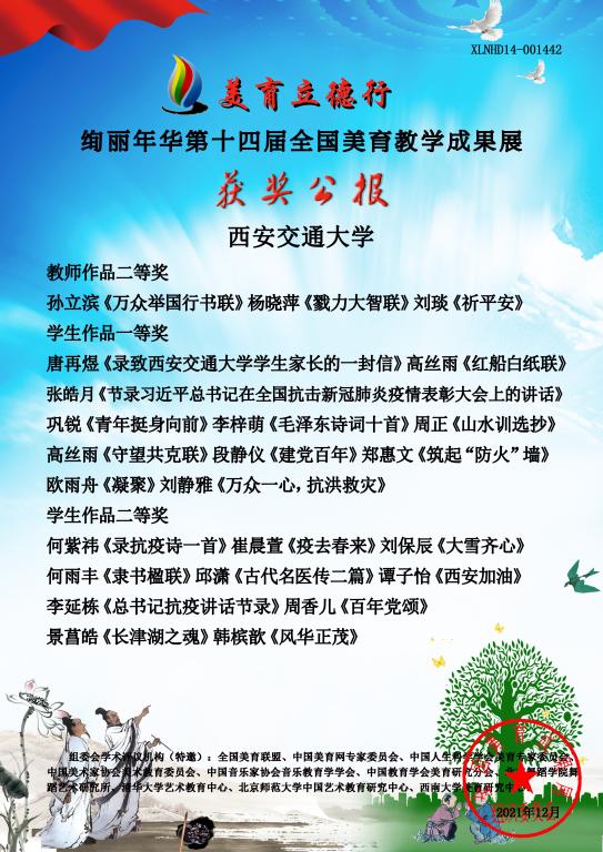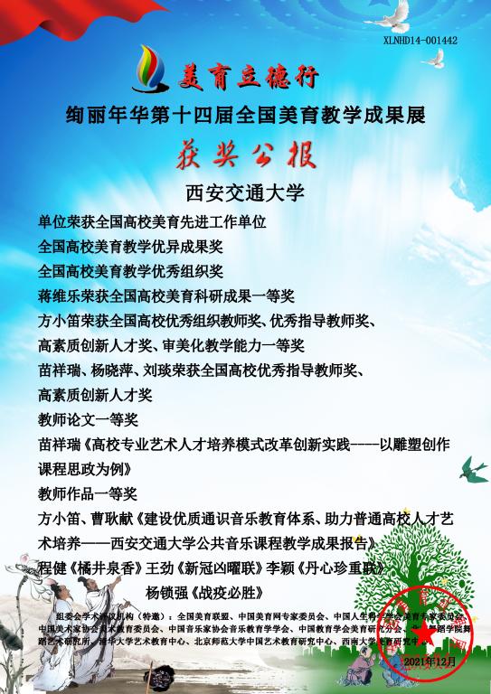 荣获“全国高校美育先进工作单位”、“全国高校美育教学优异成果奖”、“全国高校美育教学优秀组织奖”。蒋维乐获科研成果一等奖;苗祥瑞获论文一等奖;方小笛、曹耿献、程健、王劲、李颖、杨锁强等师生获作品一等奖;孙立滨、杨晓萍、刘琰等师生获作品二等奖。