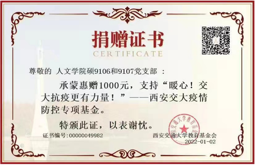 特色示范党支部并得到2000元奖金。疫情发生后,同志们一直在寻找合适的捐款渠道,元旦假期一次偶然的机会,支部书记看到有人转发西安交大疫情防控专项基金的捐款链接,于是立即在支部群里征集了大家关于捐赠的意见。意料之中,这一倡议很快得到了所有党员的一致支持,在当天下午支部就完成了捐赠,并用余下的奖金给在港的同学购买了物资。