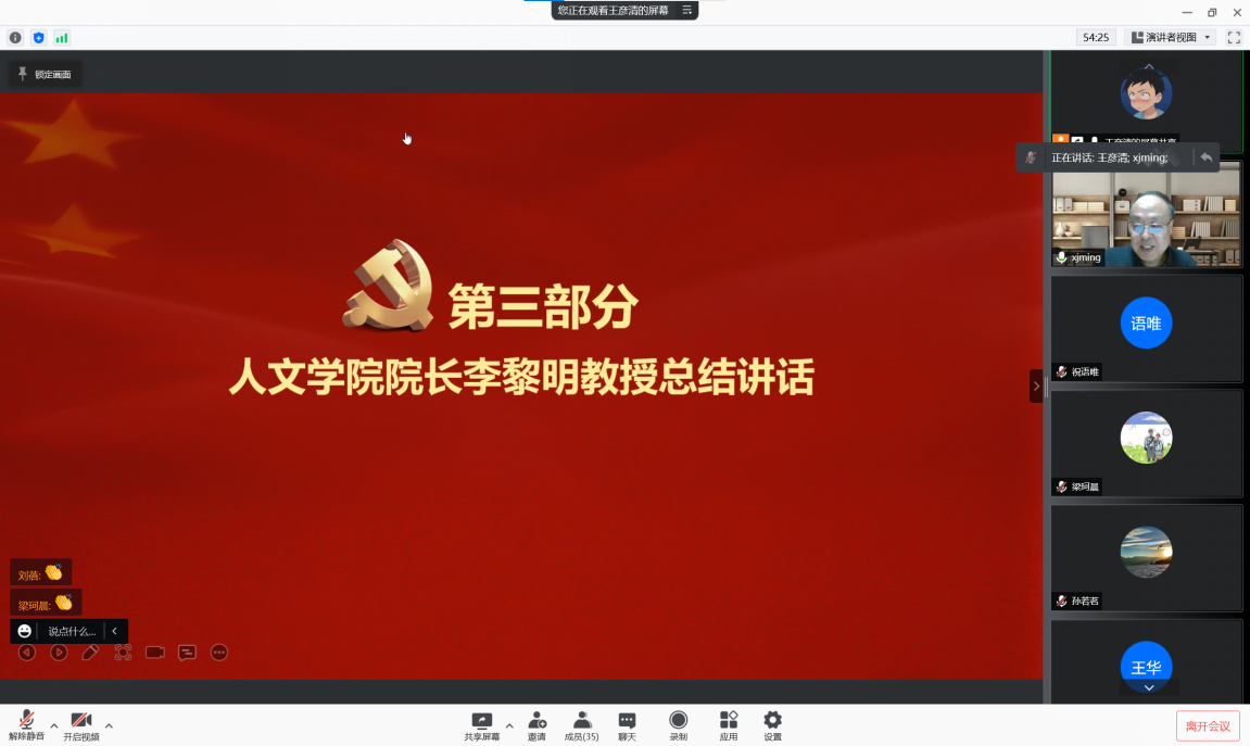 院长李黎明对本次会议表达了肯定并进行了总结,对支部成员的日常学习、工作和生活表示了关怀,同时在发挥党员先锋作用、模范带头作用和战斗堡垒作用等方面也提出了更高的要求。他认为,支部成员强烈的参与意识不仅体现了同学们的责任与担当,更体现了同学们的大格局与高站位。同时强调,重建正常社会的免疫机制,在我国是迫不及待的,而这一则责任,在我们每个人身上。因此,在这样一个关键时刻,大家都要积极发声、积极参与,做民族复兴进程的见证者、参与者和建设者。
