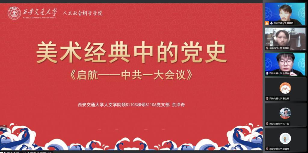 艺术设计专业硕士生佘泽奇同学进行微党课美术经典中的党史《启航——中共一大会议》的讲解,以这幅油画别具匠心的艺术创作谈及中共一大的历史背景、中共一大召开的时间考证与地点转移,最后他讲到红船精神“1921年,中国共产党诞生。这一伟大历程,是中国共产党和中国人民用鲜血、汗水、泪水写就的,充满着苦难和辉煌、曲折和胜利、付出和收获。”