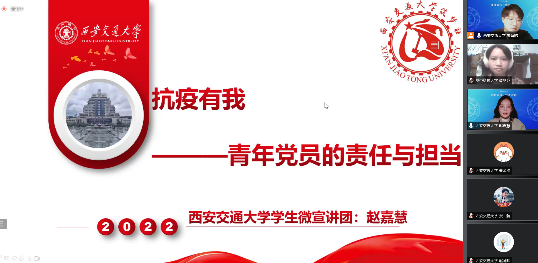 学生微宣讲团成员赵嘉慧作题为“抗疫有我——青年党员的的责任与担当”的主题宣讲,她讲述了伟大抗疫精神在交大校园的生动体现,交大医学生以“公行天下,卫戍健康”为信念,集体外出抗疫;蓝马甲成为校园内暖心、贴心、温馨的最靓丽风景线,无私奉献的志愿者争先恐后,以奋斗与担当写下青春诗行。她声情并茂地说:“没有一个冬天不能逾越,没有一场春风不会来临。待他日疫情散去,让我们共同看尽那长安繁花。”