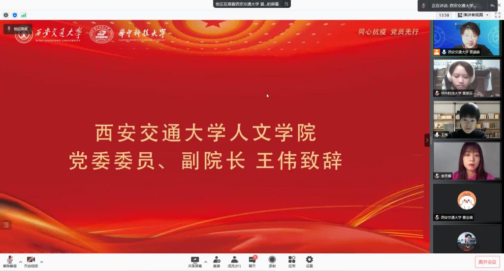 华中科技大学马克思主义学院党委副书记、副院长王明飞老师讲到“西安、武汉两个城市共同经历了抗疫,有共同的情感”,他回顾去年武汉的抗疫,感谢陕西援鄂医疗队的1460名医务工作者为武汉疫情76天清零做出的贡献,并表明了对西安疫情防控的信心。他说“西安交大的西迁精神为我们所敬佩”,最后对两校的历史渊源和交往事迹进行回顾,并祝愿两校今后能有更紧密的合作与往来。
