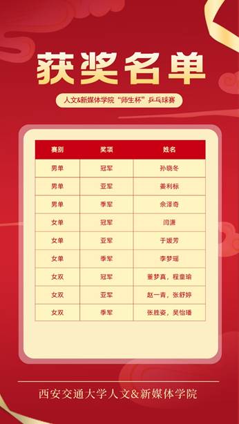 此次“师生杯”乒乓球赛为两院师生提供了一个展示自我、互相切磋的平台,拉近了同学之间、同学与老师之间的距离,让我们看到了老师们在教室之外的运动风采,同学们在工位和实验室之外的矫健身手。