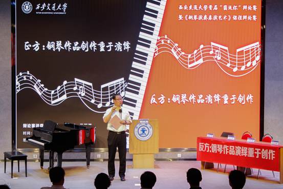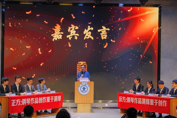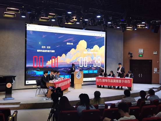 活动开始前,四位同学暖场表演。从悠扬舒缓的《乌苏里船歌》,到意志昂扬的《旱天雷》,从优美抒情的《彩云追月》,再到激越欢快的《山丹丹开花红艳艳》,四首钢琴曲引来了台下热烈的掌声。随后,来自该校各学院各专业的同学就“钢琴作品创作重于演绎,还是演绎重于创作”这一主题展开激烈辩论。