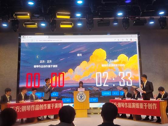 通识课程《钢琴演奏表演艺术》辩论赛的赛场,来自该校各学院各专业的同学分坐两侧,就“钢琴作品创作重于演绎,还是演绎重于创作”一问题展开激烈辩论。该比赛作为猫都论坛