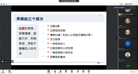 “缺乏人际界限”是钱老师反复强调的问题,在人际交往中,同学们面对的多数困扰包括无法拒绝、人际冲突、缺乏安全感、不会表达等等,这些都是缺乏人际界限产生的困境,钱老师表示“界限帮助我们在人际关系中体验到安全与舒适的预期与需求”,并结合生活中的案例详细讲述了关于界限建立的各类话题,如根据界限的三个层次培养彼此间的界限感、无法成功表达界限的四种方式、如何成功表达自己的边界、不为对方道歉、如何与难缠的人设定界限等等,并通过小练习与小测试让同学们感受边界感的正常范围。