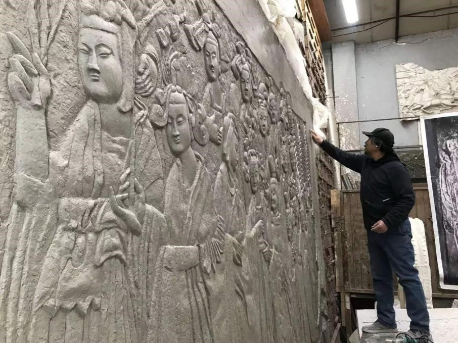 贾濯非在实验室进行龙门石窟皇后礼佛图的造型复原考证研究