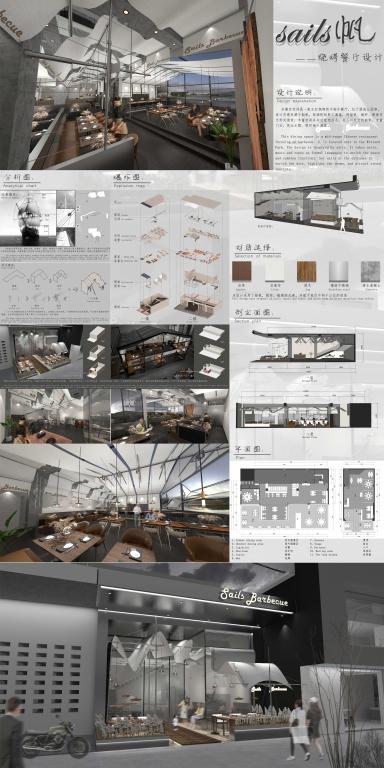本设计为餐饮空间设计,设计灵感来源于船帆,取扬帆起航之寓意,将船帆、桅杆、绳索作为形式语言,丰富空间并与功能相结合。
