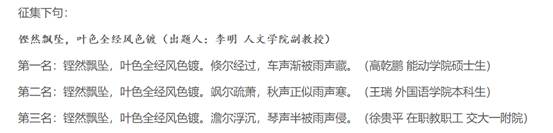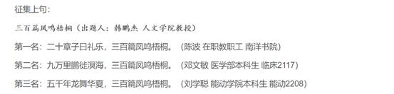 教授韩鹏杰还被邀请为联对的出题人,李明老师出上句“铿然飘坠,叶色全经风色镀”征集下句,韩鹏杰老师提供了下句“三百篇凤鸣梧桐”征集上句。两百余名参与者争相为两句联句提供对句,最终各评选出三份优秀作品。