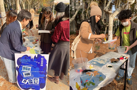 教师董琪和吴雪共同教授通识课程“图形创意”,讲解同构、混纬空间、异影等设计手法,此次“金色梧桐节”上的“靛蓝放映”活动就是综合运用课程所学的呈现。活动参与者们运用蓝晒法,在浸泡了蓝晒液体的白布上自由设计喜爱的图案,日晒后布料上便会留下图形的剪影,趣味性十足。